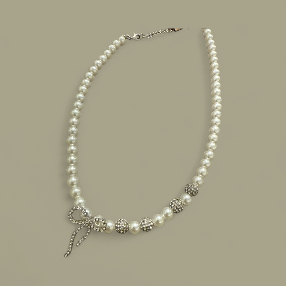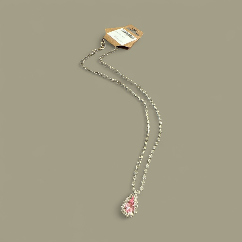 20-inch silver rhinestone necklace with pink teardrop accent.